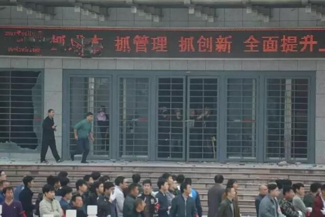 3月8日凌晨,袖纏紅護(hù)身符布條、手戴白手套,600多人拿著棍棒聚集在濟(jì)南104國(guó)道山東山水水泥集團(tuán)有限公司總部門口,強(qiáng)行沖進(jìn)大門,對(duì)辦公樓的幾個(gè)門進(jìn)行“砸打”,還從廠區(qū)強(qiáng)行把裝載機(jī)開上辦公樓門口回廊對(duì)辦公樓大門進(jìn)行蠻擊。此時(shí),集團(tuán)辦公樓里山水高管和員工只有20余人,多人在防衛(wèi)中被外邊投擲的石塊砸中受重傷,躺在醫(yī)院。