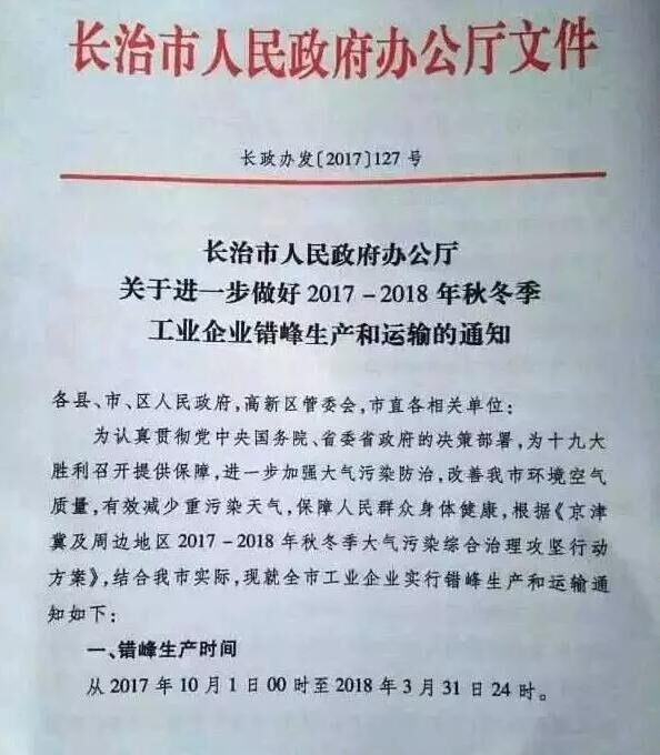 山西省長(zhǎng)治市也發(fā)布《關(guān)于進(jìn)一步做好2017-2018秋冬季工業(yè)企業(yè)錯(cuò)峰生產(chǎn)和運(yùn)輸?shù)耐ㄖ贰R笞?017年10月1日00時(shí)起至2018年3月31日24時(shí),水泥(含粉磨站)等建材行業(yè)企業(yè)全部停產(chǎn)。