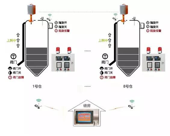 上料口側(cè):安全上料控制終端、上料安全閥,每個(gè)料倉各1個(gè),各個(gè)終端通過網(wǎng)絡(luò)連接。