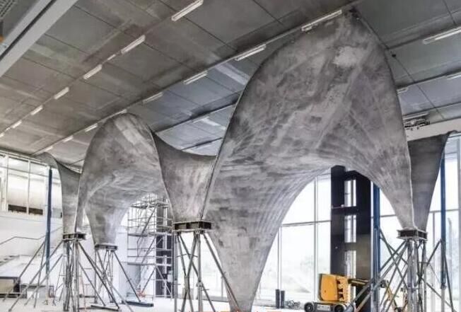 據了解,工程師們在打造過程中并沒有采用定制、一次性的木頭或泡沫支架,而是使用了他們自己設計的一種新技術。一張鋼索網被拉伸到想要的形狀,然后再在上面放置聚合織物形成一個靈活的模板。之后形狀可以通過算法控制,它能將力均勻地發(fā)布在各鋼索間并決定每個部分所需要的混凝土量。之后,鋼索網可以被拆掉、重復使用和重新調整。