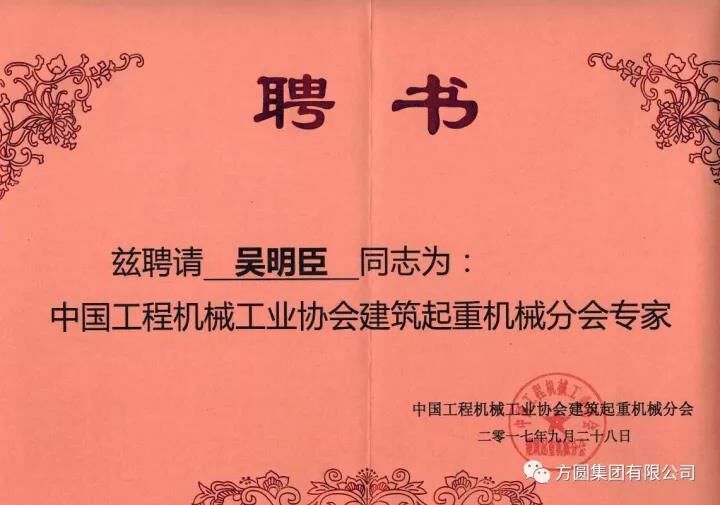 【企業(yè)】方圓集團(tuán)副總工程師吳明臣被聘為 “中國工程機(jī)械工業(yè)協(xié)會(huì)建筑起重機(jī)械分會(huì)專家”