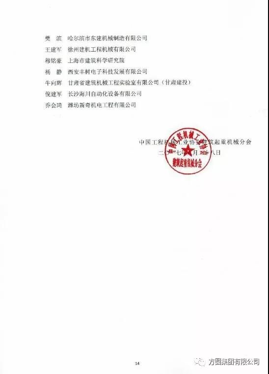 在11月9日召開的中國工程機(jī)械工業(yè)協(xié)會(huì)建筑起重機(jī)械分會(huì)年會(huì)上,以中工機(jī)協(xié)【2017】建起字11號文件公布了《關(guān)于建筑起重機(jī)械行業(yè)首批18名專家的聘用決定》,聘用首批18名專家為建筑起重機(jī)械行業(yè)專家,方圓集團(tuán)副總工程師吳明臣名列其中。