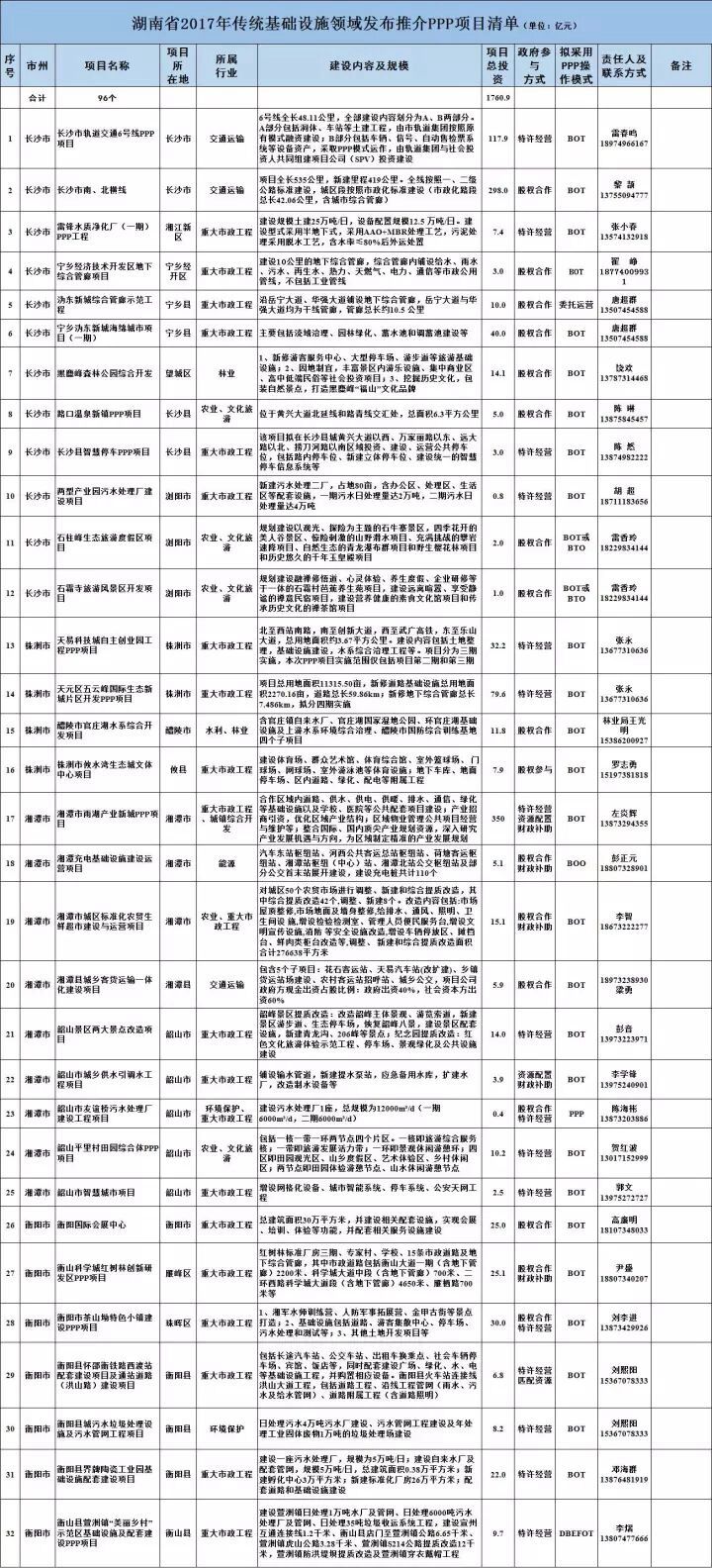 湖南發(fā)改委擬發(fā)布推介傳統(tǒng)基礎(chǔ)設(shè)施領(lǐng)域PPP項(xiàng)目96個(gè),合計(jì)總投資1760.9億元。從領(lǐng)域看,能源領(lǐng)域4個(gè),交通運(yùn)輸領(lǐng)域4個(gè),水利領(lǐng)域8個(gè),環(huán)保領(lǐng)域10個(gè),林業(yè)領(lǐng)域5個(gè),農(nóng)業(yè)領(lǐng)域10個(gè),重大市政工程領(lǐng)域55個(gè)。
