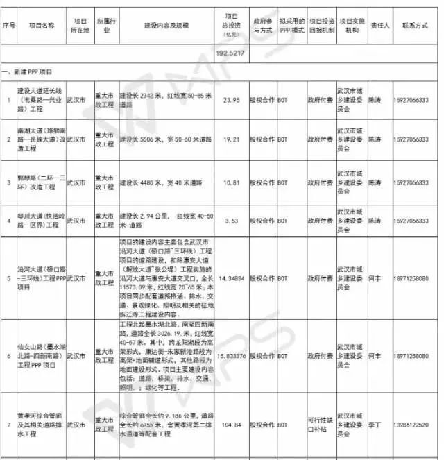 武漢市推15個(gè)PPP項(xiàng)目,總投資728.16億元,涵蓋市政道路、人工智能、綜合管廊、城鎮(zhèn)污水處理、產(chǎn)業(yè)園基礎(chǔ)設(shè)施等領(lǐng)域,其中與基建相關(guān)的項(xiàng)目7個(gè),投資192.52億元。