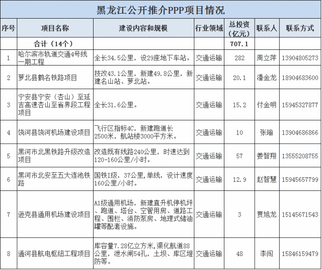 黑龍江省發(fā)改委、財(cái)政廳聯(lián)合推介交通運(yùn)輸、水利、重大市政工程等14個(gè)PPP項(xiàng)目,總投資707.1億元。
