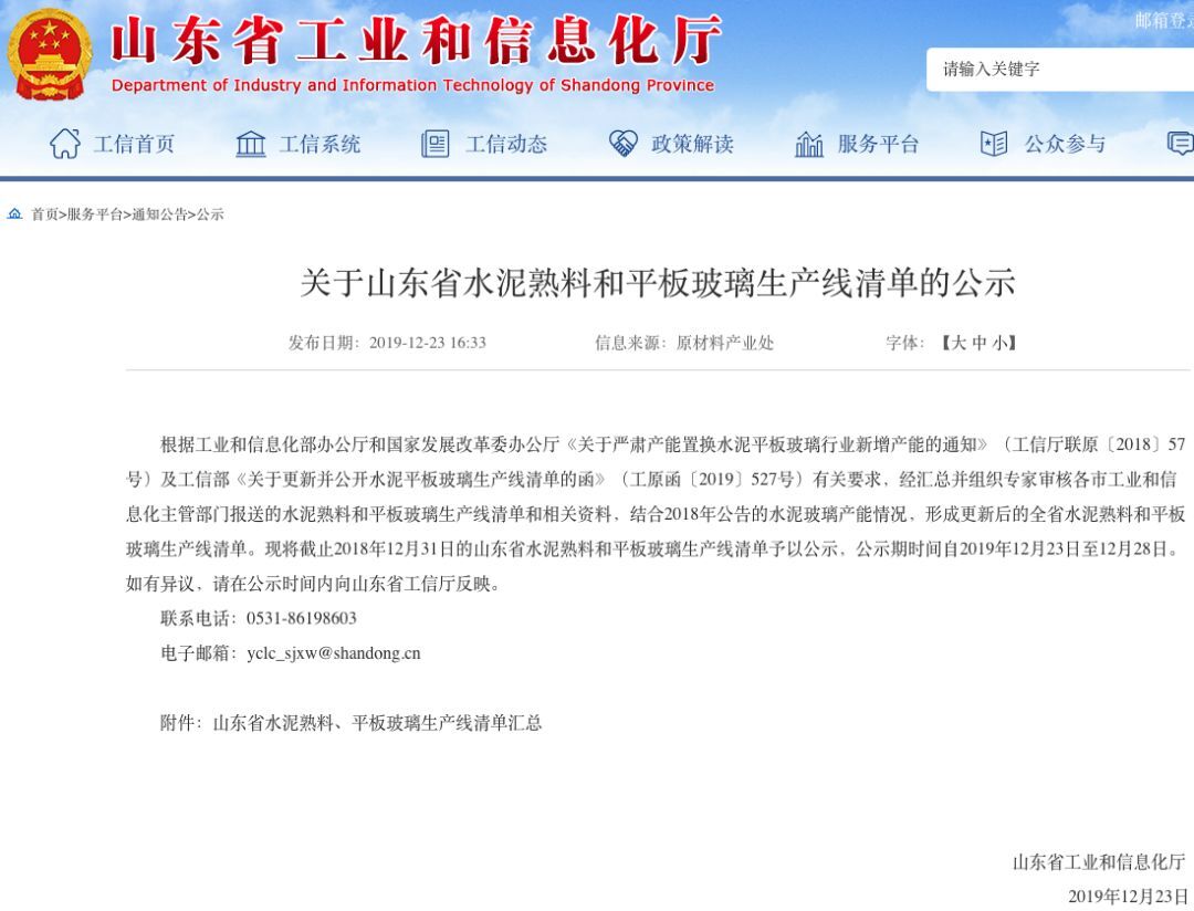 12月23日,山東省工信廳發(fā)布《關(guān)于山東省水泥熟料和平板玻璃生產(chǎn)線清單的公示》,經(jīng)匯總并組織專家審核各市工業(yè)和信息化主管部門報(bào)送的水泥熟料和平板玻璃生產(chǎn)線清單和相關(guān)資料,結(jié)合2018年公告的水泥玻璃產(chǎn)能情況,形成更新后的全省水泥熟料和平板玻璃生產(chǎn)線清單。