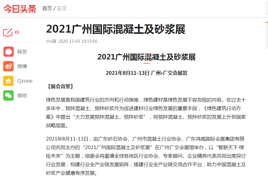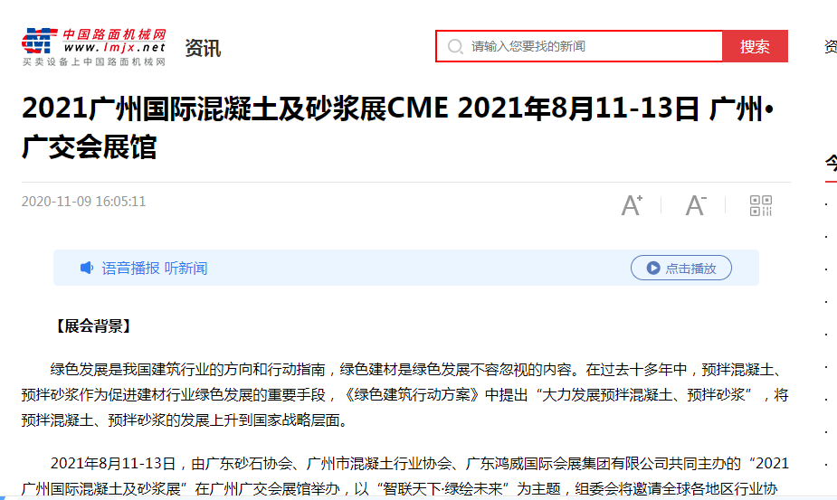 廣州國際混凝土及砂漿展已于2020年成功舉辦,自項(xiàng)目立項(xiàng)以來,得到多方媒體的關(guān)注和報(bào)道。據(jù)統(tǒng)計(jì),2020-2021年度,騰訊視頻、愛奇藝、土豆網(wǎng)、優(yōu)酷視頻等電視媒體,網(wǎng)易房產(chǎn)、新浪家居、廣州搜狐焦點(diǎn)、騰訊網(wǎng)、中國數(shù)字經(jīng)濟(jì)網(wǎng)、央廣網(wǎng)、360慧聰網(wǎng)、南方網(wǎng)、北方網(wǎng)、羊城晚報(bào)、廣州日?qǐng)?bào)、新浪網(wǎng)、新京報(bào)、21世紀(jì)經(jīng)濟(jì)報(bào)道、東方網(wǎng)、光明網(wǎng)、中國商業(yè)新聞網(wǎng)、焦點(diǎn)中國網(wǎng)等主流媒體,抖音、快手、西瓜視頻、今日頭條、百家號(hào)、火山小視頻等視頻媒體和廣東建設(shè)報(bào)、中國路面機(jī)械網(wǎng)、新型砂漿網(wǎng)、世界機(jī)械網(wǎng)、工程機(jī)械在線、攪拌設(shè)備網(wǎng)、中國保溫砂漿網(wǎng)等行業(yè)媒體,以及《混凝土雜志》、《砼時(shí)代》等雜志媒體均對(duì)展會(huì)給予高度關(guān)注,積極宣傳展會(huì)動(dòng)態(tài)與資訊。感謝各行業(yè)媒體、主流媒體、視頻媒體、雜志的大力支持與高度認(rèn)可。