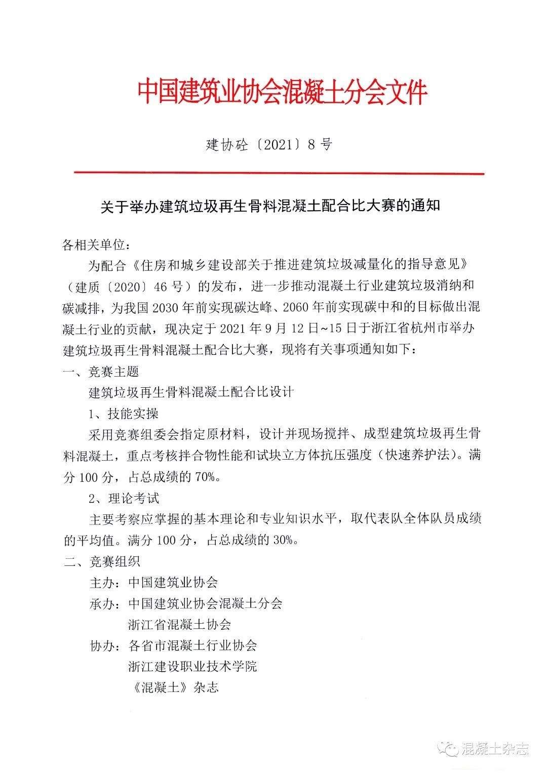 為配合《住房和城鄉(xiāng)建設(shè)部關(guān)于推進建筑垃圾減量化的指導(dǎo)意見》(建質(zhì)〔2020〕46號)的發(fā)布,進一步推動混凝土行業(yè)建筑垃圾消納和碳減排,為我國2030年前實現(xiàn)碳達峰、2060年前實現(xiàn)碳中和的目標做出混凝土行業(yè)的貢獻,現(xiàn)決定于2021年9月12日~15日于浙江省杭州市舉辦建筑垃圾再生骨料混凝土配合比大賽。