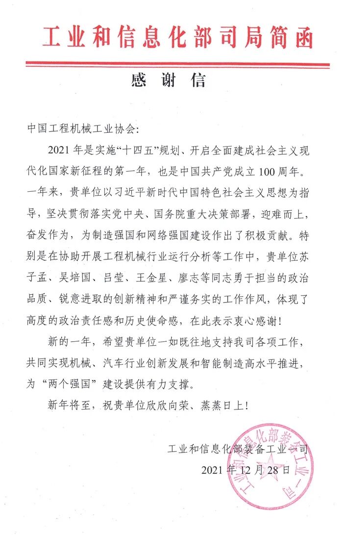 近日,工業(yè)和信息化部裝備工業(yè)一司致函中國工程機械工業(yè)協會,對協會一年來,堅持以習近平新時代中國特色社會主義思想為指導,堅決貫徹落實黨中央、國務院重大決策部署,迎難而上,奮發(fā)作為,在制造強國和網絡強國建設工作,特別是積極配合協助開展工程機械行業(yè)運行分析等工作表示感謝!