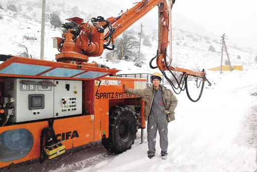 易穎志趕到工地后,發(fā)現(xiàn)設備油漆刮擦嚴重,許多部位變形,與客戶協(xié)調(diào)后,易穎志便開始檢測和開機調(diào)試。烏茲別克斯坦氣溫很低,夜間最低溫度達到了零下20多度,幾臺設備都在冰天雪地里,為保證設備盡快能使用,易穎志抵抗著極寒天氣在隧道外檢測,做各種調(diào)試。由于設備發(fā)生過碰撞,機械變形問題較多,易穎志擔心設備漏油,所以對每個有可能漏油的地方,他都會鉆到車底細心檢查,隨后再檢查設備的各項動作和功能是否正常。他自己檢測一遍后,再教工地上的當?shù)貦C手如何使用設備、保養(yǎng)設備,并開機試料,及時給出配比意見。
