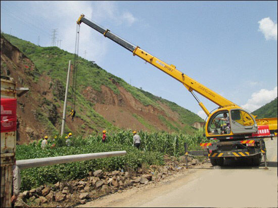 筆者連線徐工起重機事業(yè)部駐云南辦事處卞泳主任,他介紹了相關(guān)情況。8月7日上午,魯?shù)榭h城通往震中龍頭山鎮(zhèn)的道路經(jīng)過兩日的搶修和交通管制已基本暢通,武警交通部隊決定允許放行小型汽車起重機。指揮部要求南方電網(wǎng)公司迅速完成龍頭山鎮(zhèn)幾處電線桿及變壓設備的安裝。南方電網(wǎng)公司考慮道路情況惡劣,決定征用一直等候在交通管制境界線之外的一臺徐工QY12B.5汽車起重機,徐工12噸起重機迅速到達現(xiàn)場投入搶修。