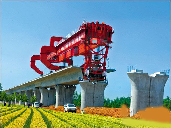 預制箱梁主要是靠每隔20至30公里建成一個的混凝土預制梁場,按需生產一定規(guī)格(主要包括20米、24米和32米,以900噸的32米箱梁居多)的預制混凝土箱梁?;炷令A制箱梁制造主要靠混凝土攪拌站、混凝土運輸車、混凝土泵(或泵車)、混凝土布料桿等機械來完成。在無法采用預制簡支梁的情況下,就必須采用現(xiàn)澆混凝土連續(xù)梁、鋼構梁等。
