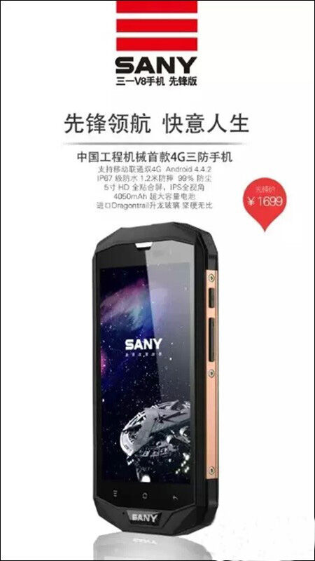 新一代的SANY V8手機(jī)是三一集團(tuán)與國(guó)際知名公司共同研發(fā)訂制的專業(yè)戶外三防手機(jī),達(dá)到國(guó)際IP67標(biāo)準(zhǔn)的防水、防塵和防震功能,同時(shí)該手機(jī)擁有1300MP像素高清拍照鏡頭,日本Dragontrail 升龍防壓防刮玻璃,5.0吋HD IPS全視角顯示頻,14.88毫米超薄合金機(jī)身,4050毫安時(shí)超大電池等亮點(diǎn)配置。該款手機(jī)設(shè)計(jì)源自德國(guó),硬朗挺拔的外形設(shè)計(jì)非常獨(dú)特;手機(jī)心臟來自美國(guó)高通公司,內(nèi)置4核1.2G高速處理器,自帶1GB DDR3 RAM,8GB ROM,搭載了安卓系統(tǒng)4.4 kitkat原裝版本運(yùn)行軟件;手機(jī)采用了日本進(jìn)口的5.0吋Dragontrail升龍玻璃,不僅適合單手操作,而且玻璃經(jīng)過了鋼化,比蘋果手機(jī)的硬度高30倍;手機(jī)配備1300萬高清攝像頭,支持水下拍攝和視頻播放;手機(jī)電池專為戶外群體考慮,達(dá)到了驚人的4050毫安時(shí),官方表示能夠提供 10小時(shí)通話和288小時(shí)的待機(jī)時(shí)間??芍С蛛p4G流暢通話,TDD-LTE 4G(移動(dòng)4G,移動(dòng)2G)和FDD-LTE 4G網(wǎng)絡(luò)(聯(lián)通4G/3G/2G)、Wi-Fi、GPS以及microSD卡擴(kuò)展等功能。SANY V8先鋒手機(jī)的機(jī)身尺寸是155x80x14.8mm,重約238g。同時(shí),手機(jī)將提供沙漠金、星空黑和三一紅三種不同的配色,完美展現(xiàn)工程之美。