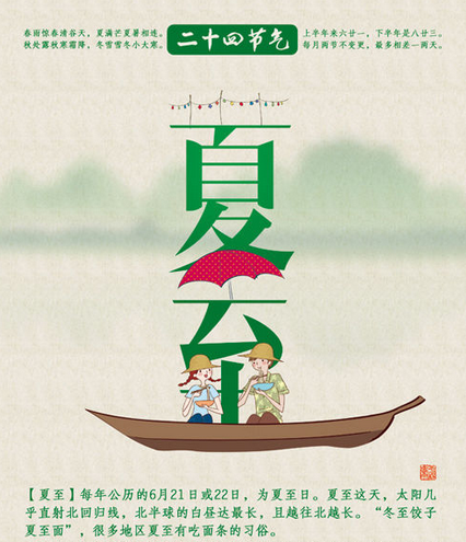 夏至是二十四節(jié)氣中最早被確定的一個節(jié)氣。公元前七世紀(jì),先人采用土圭測日影,就確定了夏至。每年的夏至從6月21日(或22日)開始,至7月7日(或8日)結(jié)束。據(jù)《恪遵憲度抄本》:“日北至,日長之至,日影短至,故曰夏至。至者,極也?!毕闹吝@天,太陽直射地面的位置到達一年的最北端,幾乎直射北回歸線(北緯23°26\'),北半球的白晝達最長,且越往北晝越長。如海南的??谑羞@天的日長約13小時多一點,杭州市為14小時,北京約15小時,而黑龍江的漠河則可達17小時以上。夏至以后,太陽直射地面的位置逐漸南移,北半球的白晝?nèi)諠u縮短。民間有“吃過夏至面,一天短一線”的說法。而此時南半球正值隆冬。