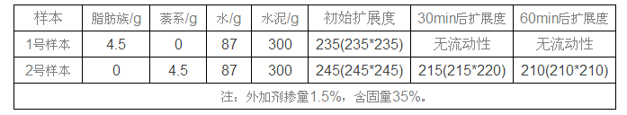 為了初步判斷這兩種外加劑對海螺牌水泥的適應性問題,首先調(diào)和成同樣固含量為的溶液,實驗數(shù)據(jù)詳見表1: