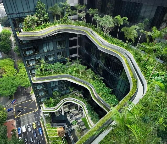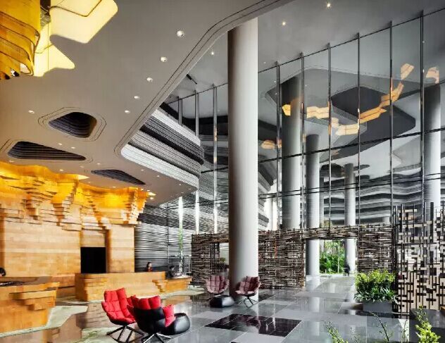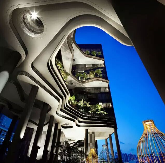 建筑流動(dòng)的幾何體給人一種高聳入云之感,塔樓每隔三層客房擁有懸挑的空中花園,上面種滿了熱帶植物,它已成為城市綠地的一部分,與鄰近公園融為一體。酒店擁有自我遮陽功能,懸挑而出的空中花園和相鄰的三座酒店客房大樓都能起到遮陽的作用,客房樓層立面采用低輻射玻璃。酒店頂樓的屋頂花園可將全城風(fēng)光一覽無余,獨(dú)家蘭花貴賓會(huì)所位處該層,并配有私人會(huì)議空間、圖書館和專用的貴賓會(huì)所門房。酒店五層設(shè)有可俯瞰城市的無邊界泳池,設(shè)備先進(jìn)的健身中心,特色的鳥籠休息涼亭及長達(dá)300米花園走道。