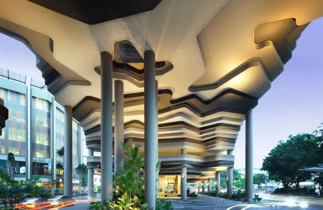 酒店位于其中心商業(yè)區(qū),是新加坡WOHA建筑事務(wù)所的杰作,負(fù)責(zé)景觀設(shè)計(jì)的為Tierra事務(wù)所。皮克林賓樂雅采用花園酒店理念,貫徹節(jié)能,已獲新加坡綠色建築最高榮譽(yù)BCA綠色建築白金獎(jiǎng),因其為首間使用太陽能酒店,獲得太陽能先鋒獎(jiǎng)。酒店樓高16層,12層高的塔樓坐落在5層高裙樓樓頂上,塔樓每隔三層懸挑一座空中花園。裙樓被波狀預(yù)制混凝土包圍,WOHA稱之為地形建筑、會(huì)呼吸的建筑。