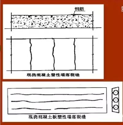 1塑性塌落裂縫塑性塌落裂縫,一般多發(fā)生在混凝土澆注過程或澆注成型后、混凝土初凝前發(fā)生,由于混凝土拌合物中的骨料在自重作用下緩慢下沉,水向上浮,即所謂的泌水,若是素混凝土,混凝土內(nèi)部下沉是均勻的,若是鋼筋混凝土,則混凝土沿鋼筋下方繼續(xù)下沉,鋼筋上面的混凝土被鋼筋支頂,使混凝土沿鋼筋表面產(chǎn)生順筋裂縫。大流動性混凝土或水灰比較大的混凝土塑性塌落裂縫問題尤為嚴重。