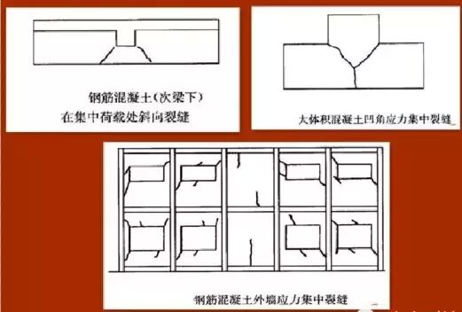 裂縫一般特征: 應力集中裂縫一般發(fā)生在門窗洞口的角部和平立面突出凹進的轉角處,且斜向楔形狀裂縫居多。在集中荷載較大的部位,易產(chǎn)生劈裂狀的裂縫。在預應力結構錨固端的局部承壓處,有時出現(xiàn)一條或數(shù)條裂縫,并呈放射形狀。