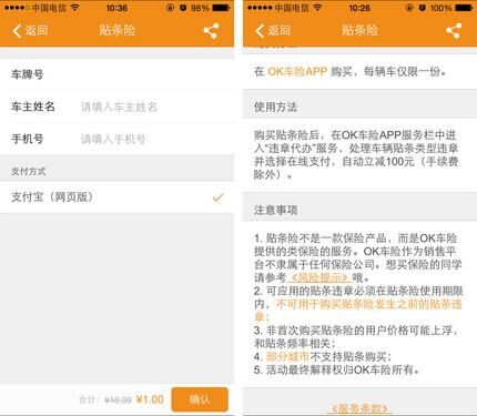 貼條險是由《OK車險》在今年3月推出的險種,用戶需支付1元,若愛車不幸被貼條可減免100元,保障期為一年,使用后可重復(fù)購買但價格會相應(yīng)提高。這款保險同樣銷售火爆,幾天時間即賣出了上萬份,《OK車險》也因此名聲大噪。