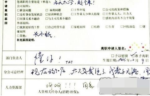 部門負(fù)責(zé)人回復(fù):“懂你,TAT”;分公司總經(jīng)理回復(fù):“現(xiàn)在的90后,太不負(fù)責(zé)任了,我表示無語。同意”;人力資源部回復(fù):“呵呵?。。⊥狻?。