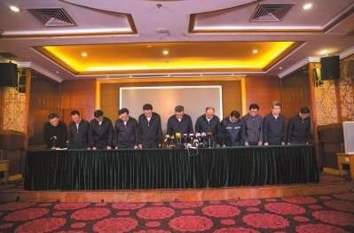 25日,深圳市委書記馬興瑞(左六)和市長許勤(左七)等深圳市和光明新區(qū)領(lǐng)導(dǎo)在發(fā)布會(huì)上鞠躬道歉。
