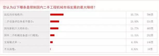 工程機(jī)械區(qū)別于其他行業(yè)一個(gè)重要的地方是,二手商品的回收利用尤為重要,因?yàn)橐粋€(gè)機(jī)械的生命周期相對(duì)于快消品來說更長,所以在二手商品的回收、租賃同樣存在巨大機(jī)會(huì)。但是該行業(yè)目前發(fā)展前景不明朗。在慧聰工程機(jī)械網(wǎng)的一項(xiàng)“限制二手工程機(jī)械市場發(fā)展的最大障礙”的投票中,“混亂的市場秩序”得票最高,796票,“二手設(shè)備評(píng)估體系不健全”排名第二,得票531,“國內(nèi)新機(jī)的巨大庫存”排名第三,得票485。