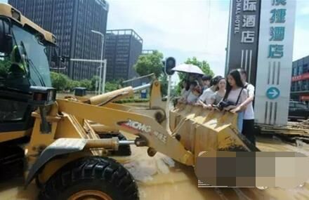 此時(shí)洪水涌動(dòng),伴隨發(fā)動(dòng)機(jī)的轟鳴聲,一抹忙碌的徐工金沖破洪水的包圍來到他們面前,將鏟斗平穩(wěn)放在地上,似紳士伸出友好之手。大家心領(lǐng)神會(huì),紛紛站進(jìn)斗里,享受這趟特殊的專車服務(wù)。