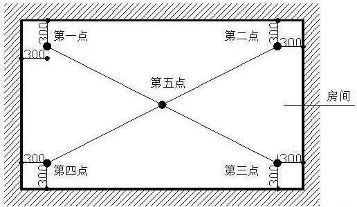 五、頂板水平度極差1、指標(biāo)說明:考慮實(shí)際測(cè)量的可操作性,選取同一功能房間混凝土頂板內(nèi)四個(gè)角點(diǎn)和一個(gè)中點(diǎn)距離同一水平基準(zhǔn)線之間5個(gè)實(shí)測(cè)值的極差值,綜合反映同一房間混凝土頂板的平整程度。2、測(cè)量工具:激光掃平儀、具有足夠剛度的5米鋼卷尺(或2米靠尺、激光測(cè)距儀)3、測(cè)量方法和數(shù)據(jù)記錄:(1)同一功能房間混凝土頂板作為1個(gè)實(shí)測(cè)區(qū),累計(jì)實(shí)測(cè)實(shí)量不得少于3個(gè)實(shí)測(cè)區(qū)。(2)使用激光掃平儀,在實(shí)測(cè)板跨內(nèi)打出一條水平基準(zhǔn)線。同一實(shí)測(cè)區(qū)距頂板天花線約30cm處位置選取4個(gè)角點(diǎn),以及板跨幾何中心位(若板單側(cè)跨度較大可在中心部位增加1個(gè)測(cè)點(diǎn)),分別測(cè)量混凝土頂板與水平基準(zhǔn)線之間的5個(gè)垂直距離。以最低點(diǎn)為基準(zhǔn)點(diǎn),計(jì)算另外四點(diǎn)與最低點(diǎn)之間的偏差。最大偏差值≤15mm時(shí),5個(gè)偏差值(基準(zhǔn)點(diǎn)偏差值以0計(jì))的實(shí)際值作為判斷該實(shí)測(cè)指標(biāo)合格率的5個(gè)計(jì)算點(diǎn)。最大偏差值﹥15mm時(shí),5個(gè)偏差值均按最大偏差值計(jì),作為判斷該實(shí)測(cè)指標(biāo)合格率的5個(gè)計(jì)算點(diǎn)。4、示例:
