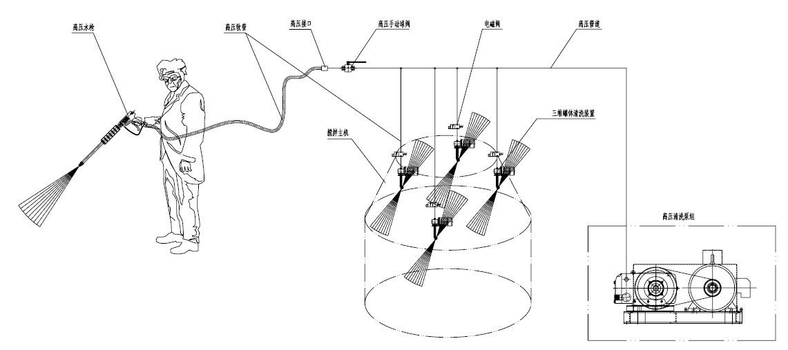 高壓清洗設(shè)備主機+三維旋轉(zhuǎn)清洗裝置,維護保養(yǎng)攪拌機內(nèi)壁的清洗利器!
