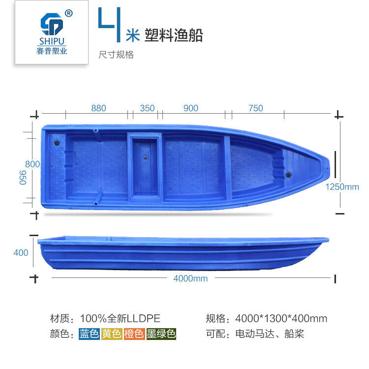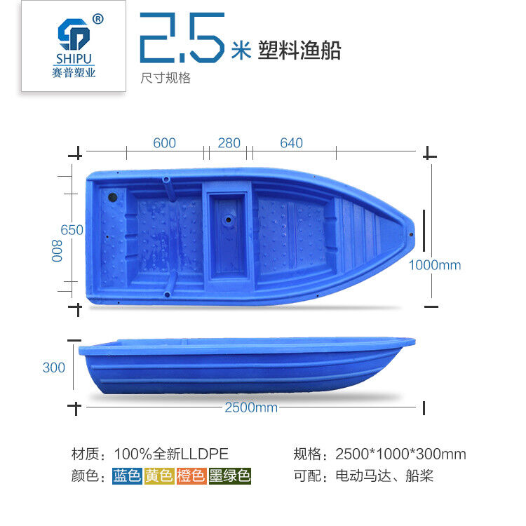 3.本公司專業(yè)生產(chǎn)的塑料漁船,是為水產(chǎn)養(yǎng)殖戶量身定做的,采用進口韓國LLDPE材質(zhì),具有很強的抗老化性,保證船的使用壽命在20年以上。一次成型,無縫焊接。顏色可改。船身都是雙層的質(zhì)量更好浮力更大 目前所有的塑料船都打上了泡沫。