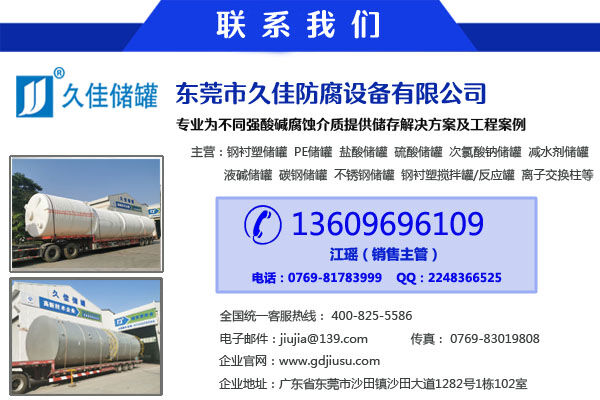 找質(zhì)量上乘、服務(wù)一流的鋼襯塑樹脂罐攪拌罐供應(yīng)商,選東莞市久佳防腐設(shè)備有限公司,公司是華南地區(qū)知名的防腐鋼襯塑攪拌罐生產(chǎn)廠家,引進(jìn)國(guó)外先進(jìn)的技術(shù)設(shè)備以及滾塑工藝,品質(zhì)保證。生產(chǎn)的防腐攪拌罐、鋼襯塑儲(chǔ)罐具有無焊接縫、不滲漏、耐腐蝕,抗老化,抗沖擊,表面光滑結(jié)合力強(qiáng)。對(duì)一般酸堿鹽的有機(jī)溶劑性能良好,適用于腐蝕性氣體,液體及固體液,漿液介質(zhì)的攪拌以及儲(chǔ)存輸送。