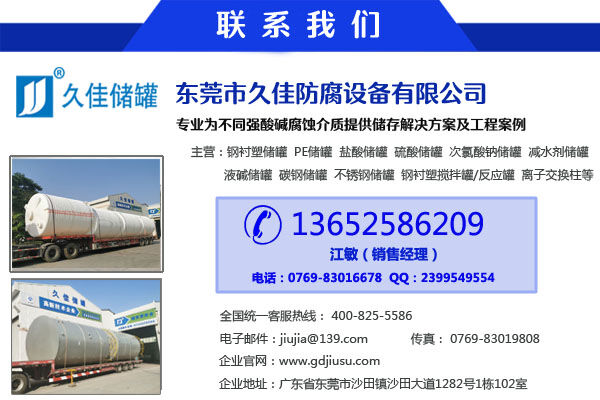 東莞市久佳防腐設備主營產品有鋼襯塑儲罐、全塑儲罐、碳鋼儲罐、離子交換柱、攪拌罐等防腐設備,主要有鋼襯塑和全塑兩大系列,分臥式和立式,品種齊全,可滿足客戶的需求,廣泛應用于化工、環(huán)保、電力、釀造、儲存、運輸?shù)刃袠I(yè)。
