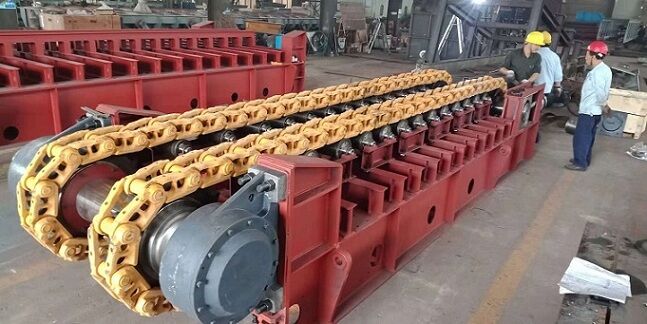 由于板喂機是通過鏈輪、鏈條、鏈板、傳動等一系列全鋼結(jié)構(gòu)的剛性機架將物料拖出庫底的。所有的料倉壓力由板式給料機承擔(dān),避免的由于料倉壓力過大把皮帶秤壓壞現(xiàn)象。