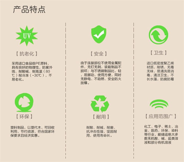 1、采用全新進口聚乙烯PE料制作無毒、無味,質(zhì)輕堅韌、安裝移動簡便,全部采用進口塑料制成,不添加回料,質(zhì)量有保證。