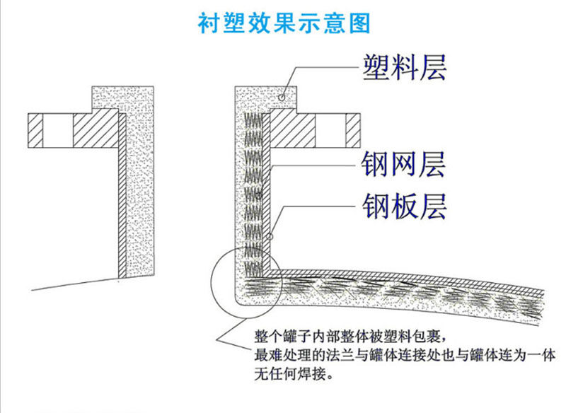 鋼襯塑產(chǎn)品一般由桶身、平底、封頂、人孔、進(jìn)料口法蘭、出料口法蘭和液位孔口法蘭組成,臥室鋼襯塑儲罐通常還有標(biāo)準(zhǔn)鋼質(zhì)支座,鋼襯塑產(chǎn)品一般根據(jù)用戶要求設(shè)計(jì)制造。