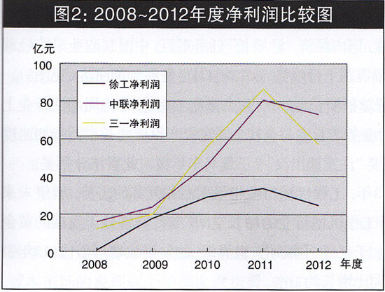 公司的成長與盈利能力正相關(guān)。在年報(bào)中,主營業(yè)務(wù)收入增長率、凈利潤增長率、凈資產(chǎn)增長率以及凈資產(chǎn)收益率、毛利率、凈利率等財(cái)務(wù)指標(biāo),是判斷企業(yè)成長性和盈利能力的重要指標(biāo)。表2顯示,三駕馬車中,5年主營業(yè)務(wù)收入同比增長率實(shí)現(xiàn)連續(xù)5年正增長、連續(xù)三年保持30%以上增長率的公司是中聯(lián),五年中增長率振幅最大的公司是徐工,2012年徐工和三—主營業(yè)務(wù)收入增長率均出現(xiàn)負(fù)增長;表2還顯示,凈利潤同比增長率方面,沒有—家公司連續(xù)五年正增長,2012年三駕馬車同時(shí)出現(xiàn)負(fù)增長,三一錄得-34.26%的最大降幅。在大環(huán)境不利因素作用下,公司成長性受到嚴(yán)峻挑戰(zhàn)(見圖2)。