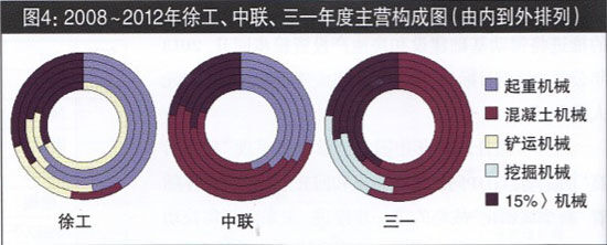 圖4 2008~2012年徐工、中聯(lián)、三一年度主營構(gòu)成圖