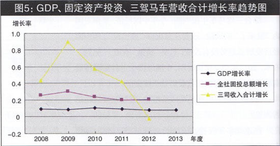 周期性行業(yè)受周期制約的特點(diǎn),決定周期性行業(yè)要避免誤判宏觀經(jīng)濟(jì)發(fā)展趨勢(shì),才能健康發(fā)展。5年來,三駕馬車—直在擴(kuò)張產(chǎn)能,在經(jīng)濟(jì)下行壓力加大、GDP增長率持續(xù)回落的宏觀背景下,主要財(cái)務(wù)指標(biāo)必然加速度回落(見圖4)。面對(duì)如此局面,要保持增長勢(shì)頭,就必須準(zhǔn)確判斷宏觀經(jīng)濟(jì)趨勢(shì),調(diào)整企業(yè)發(fā)展戰(zhàn)略。三駕馬車,是如何判斷宏觀經(jīng)濟(jì)發(fā)展趨勢(shì)的呢?