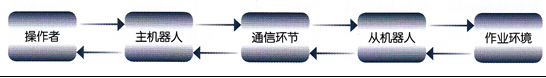 工程機(jī)器人研究的現(xiàn)狀表明,由于受到機(jī)構(gòu)、控制、傳感器以及人工智能水平的限制,研究出能在未知環(huán)境中全自主方式工作的機(jī)器人是目前難以實(shí)現(xiàn)的目標(biāo)。因此,目前在核工業(yè)、搶險(xiǎn)救災(zāi)等高危、惡劣的環(huán)境中被廣泛應(yīng)用的是遙操作機(jī)器人。遙操作機(jī)器人主要分為視覺臨場(chǎng)感遙操作機(jī)器人、力覺臨場(chǎng)感遙操作機(jī)器人、觸覺臨場(chǎng)感遙操作機(jī)器人及運(yùn)動(dòng)覺臨場(chǎng)感遙操作機(jī)器人等?;谂R場(chǎng)感的遙操作機(jī)器人系統(tǒng)原理如圖3所示,它由操作者、主機(jī)器人(手控器)、通訊環(huán)節(jié)、從機(jī)器人和作業(yè)環(huán)境5部分構(gòu)成。在臨場(chǎng)感系統(tǒng)工作過程中,由操作者向主機(jī)器人發(fā)出操作命令(如位置指令)操作主機(jī)器人運(yùn)動(dòng),主機(jī)器人的運(yùn)動(dòng)信息通過通訊環(huán)節(jié)傳給遠(yuǎn)方的從機(jī)器人,從而控制從機(jī)器人的運(yùn)動(dòng);當(dāng)從機(jī)器人同環(huán)境交互時(shí),從機(jī)器人的運(yùn)動(dòng)信息(如視覺、力覺、觸覺等信息)又通過通訊環(huán)節(jié)反饋給本地主機(jī)器人,使操作者對(duì)于現(xiàn)場(chǎng)作業(yè)情況有了有效的感知,從而能夠及時(shí)做出準(zhǔn)確判斷,發(fā)出相應(yīng)的操作命令,控制遠(yuǎn)方從機(jī)器人準(zhǔn)確、高效地完成作業(yè)任務(wù)。目前,基于視覺臨場(chǎng)感的工程機(jī)器人遙操作控制主要是用攝像機(jī)獲取現(xiàn)場(chǎng)的視頻圖像并回傳到主控端,操縱者通過監(jiān)視器來完成對(duì)工程機(jī)器人的操作任務(wù)。